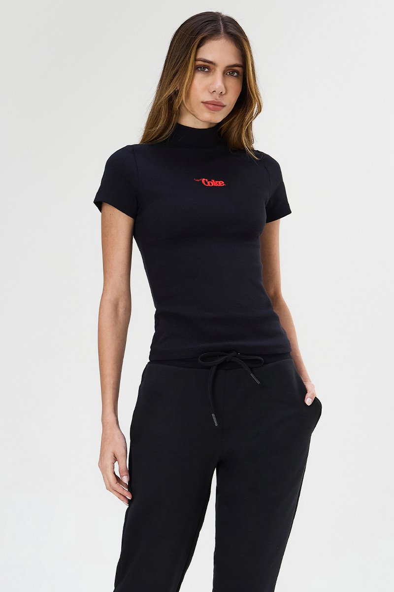 A Blusa Canelada Coke é feita em malha canelada de algodão com stretch, garantindo caimento preciso e conforto ao corpo. Com gola alta, manga curta e shape justo, a peça valoriza a silhueta com elegância. O bordado frontal “Coke” finaliza o design com autenticidade e assinatura da marca.
