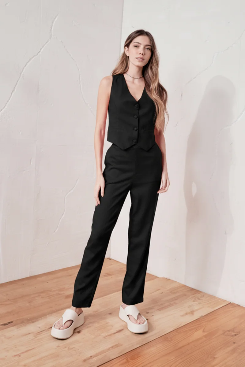 A Calça Alfaiataria Linho Cós Elástico Coca-Cola apresenta uma proposta sofisticada e moderna. Confeccionada em viscose com linho, o tecido oferece toque macio, leveza e caimento fluido. Possui shape reto, zíper invisível lateral, cós liso frontal e elástico embutido nas costas, garantindo ajuste preciso e conforto. Conta ainda com bolso faca funcional e pingente de metal Coca-Cola na lateral, adicionando personalidade à peça. Pode ser usada em conjunto com o colete do mesmo tecido, formando um conjunto elegante e contemporâneo.