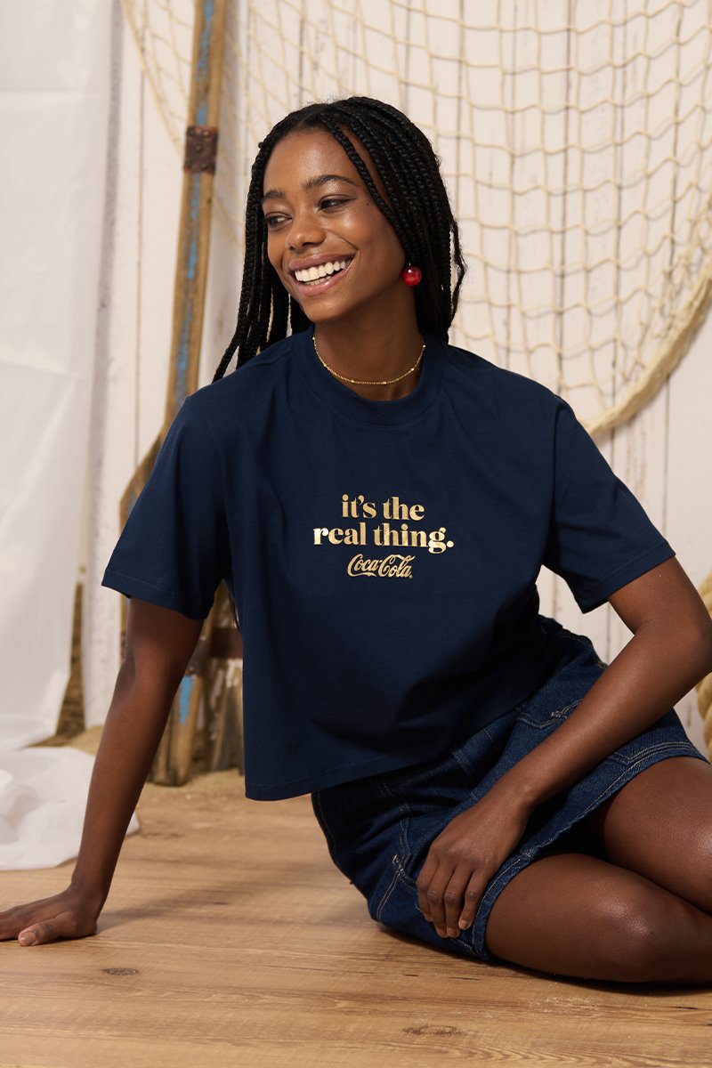 A Camiseta Cropped It’s The Real Thing traz atitude e autenticidade em um visual moderno e cheio de personalidade. Confeccionada em malha penteada 30/1, com 100% algodão BCI, oferece conforto, toque macio e excelente caimento para o dia a dia. A estampa frontal em lettering com foil dourado “It’s the real thing” é o destaque da peça, adicionando brilho e identidade icônica ao look. O decote redondo, as mangas curtas e a modelagem cropped garantem um visual atual e versátil. A assinatura “C” no decote das costas finaliza com um detalhe exclusivo da marca.