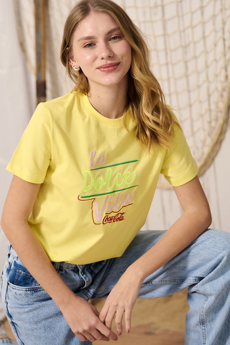 A Camiseta La Dolce Vita Coca-Cola é confeccionada em malha penteada 30/01 de 100% algodão BCI, proporcionando toque macio, conforto térmico e excelente respirabilidade para o uso no dia a dia. Possui modelagem comfort, garantindo caimento mais solto e confortável. O modelo conta com mangas curtas e decote redondo em ribana, que oferecem melhor ajuste e acabamento. Apresenta etiqueta bandeira Coca-Cola aplicada na lateral, estampa “C” no decote das costas e bordado frontal “La Dolce Vita – Coca-Cola”, que traz um toque sofisticado e reforça a identidade da marca. A Camiseta Coca-Cola é uma peça casual e versátil, ideal para combinações com jeans, shorts ou saias, adaptando-se facilmente a diferentes propostas de look.