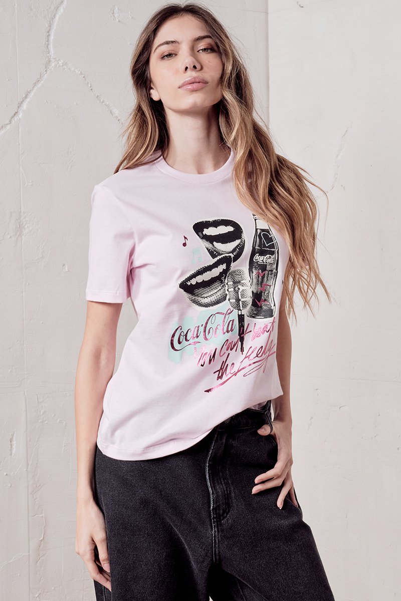 O ritmo dos festivais traduzido em um look cheio de atitude. Confeccionada em malha penteada 30/1 de algodão BCI (Better Cotton Initiative), essa camiseta combina conforto e responsabilidade, o algodão BCI apoia práticas de cultivo mais sustentáveis, cuidando de quem planta e do planeta. Com modelagem comfort, mangas curtas e decote redondo, ela entrega caimento leve e versátil para o dia a dia. O destaque fica por conta da estampa exclusiva Mixtape, que mistura referências musicais, arte e a icônica garrafa Coca-Cola, traduzindo a união entre moda e música com autenticidade. Use com jeans, saias ou peças utilitárias e leve a vibe dos palcos para o seu estilo urbano.