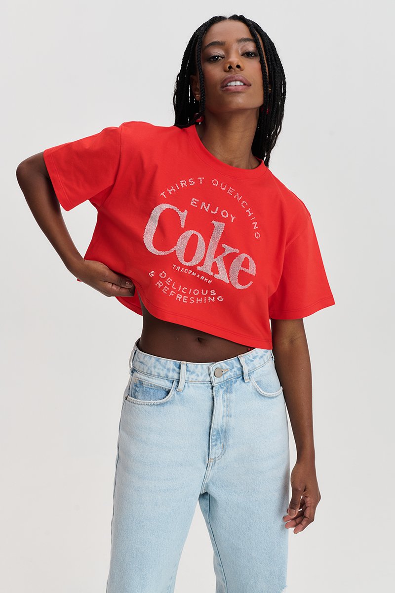 O Cropped Enjoy Coke combina estilo clássico, autenticidade e conforto em uma peça moderna e versátil. Confeccionado em 100% algodão BCI (Better Cotton Initiative), utiliza algodão produzido de forma mais responsável, garantindo maciez, durabilidade e menor impacto ambiental, perfeito para quem busca qualidade aliada a práticas mais sustentáveis. Feito em malha penteada 30/1, o cropped oferece toque suave, excelente respirabilidade e caimento superior. Sua modelagem regular proporciona ajuste confortável e equilibrado, mantendo a estrutura da peça sem ficar justa ou ampla demais, entregando um visual atual e fácil de combinar. O design traz decote redondo, manga curta e a icônica estampa em lettering frontal com brilho: “Thirst Quenching Enjoy Coke – Delicious & Refreshing”, que remete ao estilo retrô e original da marca. Nas costas, o detalhe no decote com a letra “C” adiciona assinatura exclusiva, finalizando o design com o DNA autêntico da Coca-Cola.