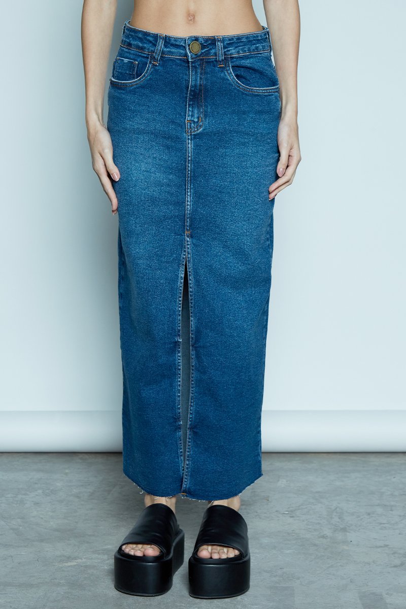 A Saia Jeans Washed Coca-Cola combina sofisticação e autenticidade em uma peça atemporal. Confeccionada em jeans de algodão com 2% de stretch, oferece caimento estruturado com um toque de conforto e liberdade de movimentos. O modelo super midi conta com fenda frontal, barra desfiada e lavagem em tom azul médio, que traz modernidade e estilo. Possui cós com passantes, fechamento frontal por zíper e botão de metal com gravação Coca-Cola em baixo relevo, além de bolsos frontais americanos funcionais e bolsos aplicados nas costas com rebites. Finalizada com a etiqueta personalizada no cós, a peça reforça toda a identidade e autenticidade da marca, tornando-se ideal para compor looks casuais sofisticados ou produções urbanas cheias de personalidade.