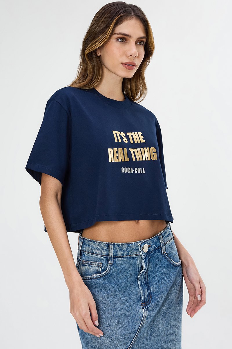 A T-shirt Cropped Real Thing Coca-Cola combina estilo urbano com toque moderno. Confeccionada em malha 30/1 penteada de algodão BCI, proporciona toque macio, maior resistência e caimento impecável na modelagem Cropped. A estampa frontal lettering em foil “It’s the real thing - Coca-Cola” adiciona brilho e personalidade ao design.