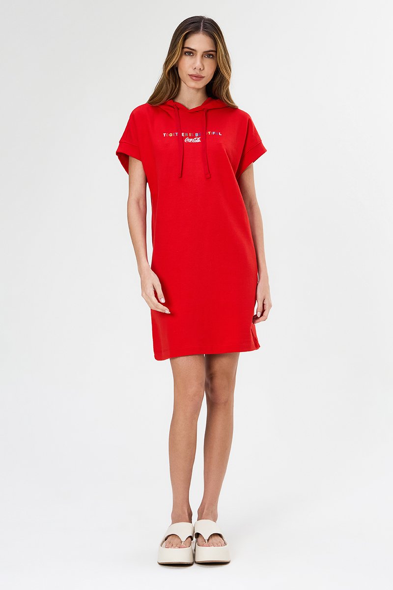 Cheio de personalidade, o Vestido Loved Coca-Cola se destaca pela estampa frontal “Together is Beautiful – Coca-Cola”. Confeccionado em moletom 100% algodão com modelagem Comfort e comprimento curto, oferece caimento perfeito e conforto máximo. O design conta com manga curta e capuz com cadarço, unindo estilo e autenticidade.